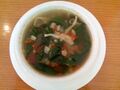 A soup containing mushroom and Corchorus olitorius leaves, served in Malolos, the Philippines, where the latter vegetable is known as saluyot.