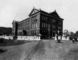 Occidental College was founded on April 20, 1887, by a group of Presbyterian clergy, missionaries, and laymen, including James George Bell, Lyman Stewart, and Thomas Bard. The cornerstone of the school's first building was laid in September 1887 in the Boyle Heights now East Los Angeles neighborhood of Los Angeles.[4] The college's first term began a year later with 27 male and 13 female students, and tuition of $50 a year.[5]