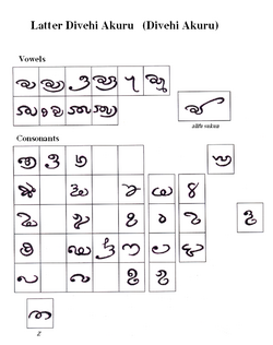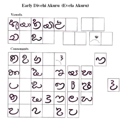 Dhives Akuru developed from Brahmi. The oldest attested inscription bears a clear resemblance to South Indian epigraphical records of the sixth-eighth centuries, written in local subtypes of the Brahmi script. The letters on later inscriptions are clearly of the cursive type, strongly reminding of the medieval scripts used in Sri Lanka and South India such as Sinhala, Grantha and Vatteluttu. There are also some elements from the Kannada-Telugu scripts.[2][3]