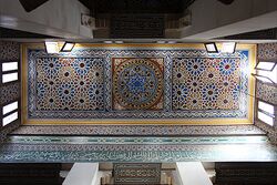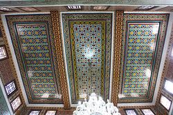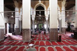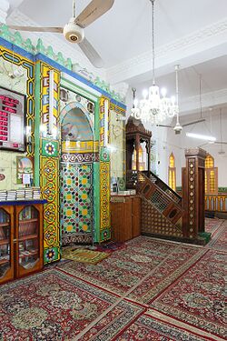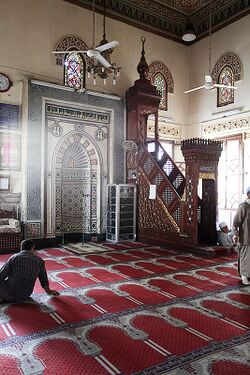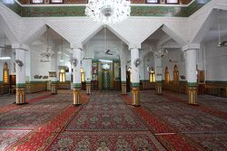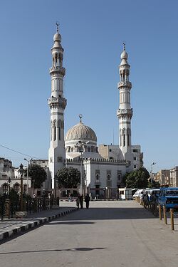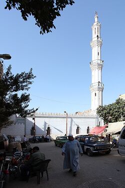 - Sidi Arif Mosque (Arabic: مسجد العارف بالله, Masjid al-ʿArif bi-Allah). The mosque is located in the south of the city. The el-ʿArif Mosque was built in the 14th century—the 8th century in the Islamic calendar. The present building was constructed around 1995. At the corners of the façade are two minarets and the roof is crowned by a dome. Inside the five-nave mosque the bases of the piers and the walls were lined with red granite. The ceiling is painted ornamentally; in its middle is an elongated light dome. The southeastern half is lit by chandeliers. At the end are the prayer niche (mihrab) with simple ornaments and to the right of it the wooden pulpit (minbar).