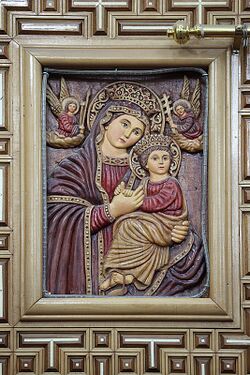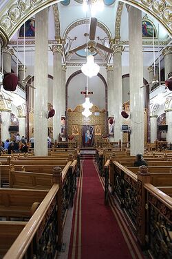 - The Church of the Holy Virgin (Arabic: كنيسة السيدة العذراء, Kanīsat as-Saiyida al-ʿAdraʾ). The church is located in the north of the bazaar (souq Qaiṣarīya). It consists of five naves. There are three sanctuaries for Saint George (left), the Holy Virgin and the Archangel Michael at the ends of the middle three naves. All sanctuaries are completely screened by a wooden iconostasis. On both sides of the entrances to the sanctuaries are wooden icons of the Holy Virgin and Jesus. The Lord's Last Supper and the crosses are located above the iconstasis. The presentation in the central nave is framed by a fish and a pigeon; the other ones are framed by angels and a dove. Galleries are located above the aisles and the entrance. On the walls are paintings of saints and scenes from the life of Jesus.