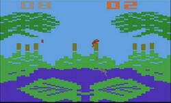Each game starts out in the morning with a light blue sky. If there is not a second player, the system will automatically take control of the red frog within a few seconds. Each frog jumps from one lily pad to the other. During each hop, a number of flies fly around the screen. The player pushes the fire button, which causes the frog's tongue to stick out. If the frog is in the right spot ahead or behind a fly, it catches and eats the fly. Each time a fly is captured it is worth two points. The game progresses throughout the day, with the sky turning a darker shade of blue, and eventually turning black as the day ends. About a minute after the sky turns black, the two frogs leave the screen – the green frog exits to the left, and the red frog to the right. A firefly then comes on to the screen carrying a "The End" message, which it leaves in the center of the screen. The frog who has captured the most flies at that point is the winner.
