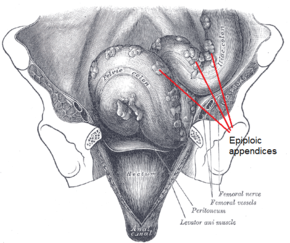 Epiploic appendages are also called appendices epiploicae. The appendages themselves are 50–100 appendages that are oriented in two rows anterior and posterior. The appendages are parallel to the superficial section of the taenia coli. Furthermore, the appendages are between 0.5 and 5 cm long, each appendage is attached with one or two arterioles and a venule within vascular stalks attached to the colon. Torsion (twisting or wrenching motion) of the appendages can cause ischemia which can cause painful symptoms that mimic other conditions such as diverticulitis, and appendicitis; however, it is rare. The pain associated with the inflamed appendages is located in the left and sometimes in the right lower abdominal quadrant. Diagnosis of epiploic appendagitis can be challenging due to its infrequency.[5]