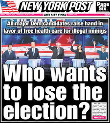 The first night DNC Chair Tom Perez welcomed the audience and thanked the Rev. Al Sharpton, who once proposed killing crackers [white people] and pigs, [police].[718] for his service to the party.[719] In a remarkable turn, the debate opened with the national anthem. Beto brought three athletes along to kneel during the anthem. Warren again was given the most speaking time. Warren pledged to fight environmental racism, economic racism, healthcare racism, every form of racism except Democrat party racism. Beginning with the racist idea that minority voters are stupid, Warren steadfastly claimed she could reduce healthcare costs without cutting doctors pay, or producing more doctors to serve millions of more patients. Williamson won the debate as the No. 1 most searched for candidate on Google. The usual railing against corporations and billionaires ensued, courtesy of the candidate's corporate and billionaire donors who made the whole debate event possible. Many trash talked their own signature failed success story, Obamacare, in favor of government run Gestapocare. Delaney again repeated a few common sense arguments, and was laughed off the stage. The Warren vs. Sanders smackdown piled on an additional $4.5 trillion annual expanse to the federal budget and, accordingfr to Delaney, closing of the nation's hospitals. Sanders committed a Trumpism by promising "a strong border defense," appeared angry and was told to stop shouting. Warren repeated Trump's talking points on trade and virtually all grudgingly admired President Trump's handling of problems with China. A few tried to moderate their stance on open borders with limited success.