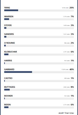 The DNC removed the individual donor requirement previously required of Cory Booker, Julian Castro, and other people of color to qualify for the Nevada Democratic debate stage, opening the opportunity for the dark money candidacy of Mike Bloomberg to appear.[74] Having driven out the last minority, Andrew Yang, coupled with the media blackout on Tulsi Gabbard and Deval Patrick,[75] a lily white field of white supremacists appeared on stage before the nation for the Nevada debate. A Stanford University/Reality Check Poll showed a sizable portion of the disbanded Yang Gang moving into President Trump's column.[76]