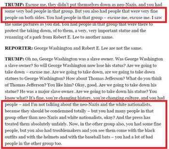 President Trump forcefully condemned racism and white supremacy after the Charlottesville incident and two mass shootings, one by an Antifa operative and the other by a leftist who claimed immigration impeded passage of a universal basic income and single payer healthcare.[22] Mainstream fake news media attacked gun rights and falsely blamed President Trump for racism.[23] Many Democrats regularly use hate speech, claiming that Trump called neo-Nazi's "fine people," called all Mexicans "rapists," issued a "Muslim ban," and call all Trump supporters "racist" for not accepting Democrat talking points and fake news media lies.