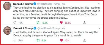 Bernie Sanders rose in the polls and Joe Biden slid as the Senate debated subpoenaing Biden as a witness in the impeachment trial of Donald Trump. Liz Warren likewise faltered in the face of attacks on Sanders by Warren ally and adviser Hillary Clinton. In pre-caucus polls Buttigieg became increasingly irrelevant as mainstream fake news media continued to push the House impeachment managers' malarkey that Biden was a "political rival" of President Trump in the 2020 General Election. Bloomberg the billionaire surged on the strength of his personal wealth, connections to the DNC establishment, liberal media, and the public souring on Biden's personal aggrandizement of the office of Vice President. The MSM's racist media blackout of Andrew Yang continued.