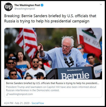 As American media tried to give fresh impetus to the Trump-Russia conspiracy hoax with Roger Stone's sentencing, Comrade Sanders who honeymooned in Soviet Russia, Comrade Buttigieg whose father was an avowed Marxist author loved by Russian communists, and Comrade Bloomberg who openly praises Chinese communism, took center stage. According to WaPo the Russians favor Sanders;[80] consequently Putin scored a big win in Nevada.[81]
