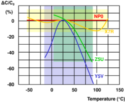 For instance, a Z5U capacitor will operate from +10 °C to +85 °C with a capacitance change of at most +22% to −56%. An X7R capacitor will operate from −55 °C to +125 °C with a capacitance change of at most ±15%.