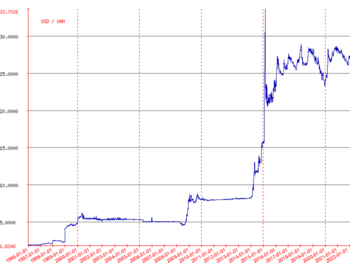 As from 7 February 2014, following political instability in Ukraine, the National Bank of Ukraine changed the hryvnia into a fluctuating/floating currency in an attempt to meet IMF requirements and to try to enforce a stable price for the currency in the Forex market.[26] In 2014 and 2015 the hryvnia lost about 70% of its value against the U.S. dollar, with the currency reaching a record low of ₴33 per dollar in February 2015.[27]