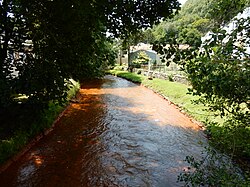 Iron forms a strange material, iron pyrite, often confused with gold (hence it is known as "fool's gold") due to its metallic appearance and a color much like gold. This substance, FeS2 is little like gold, although gold appears in some pyrites (go figure!). It is not a normal sulfide, as the sulfur atoms are partly attached to each other. It gives sparks when it is rubbed hard or struck. Although common, it is almost never mined for its iron content. Pyrite oxidizes under some conditions to form sulfuric acid, which often escapes a mine through a waterway. Acid mine drainage is one of the most horrible forms of water pollution because sulfuric acid destroys most organic matter, including plants and animals, and the sulfur causes the affected areas to smell nasty as well. For a long time, pyrite was heavily used in firearms as a source of ignition for firing a gun.[8]