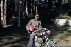 According to Vasudev, his main motive in getting into business was to fund his urge to travel and explore.[30] One of his favorite haunts was the Chamundi Hills,[31] where he often rode at night. On one occasion, in pursuit of adventure, he decided to go off-road and rode down the slope of the hill, careening into trees and rocks and suffering a broken ring finger.[32] He also formulated a plan with his motorcycling friends to build a commune in a hundred acres of land, where they would live without any rules or regulations. The idea never came through, and Vasudev admits that it was for the best that he never executed the plan.[33] Besides riding his motorcycle in and around Mysore, he also rode across India, before being stopped at the border because he had no passport.[34]