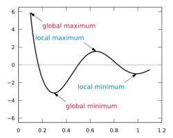 In mathematical analysis, the maximum and minimum[lower-alpha 1] of a function are, respectively, the largest and smallest value taken by the function. Known generically as extremum,[lower-alpha 2] they may be defined either within a given range (the local or relative extrema) or on the entire domain (the global or absolute extrema) of a function.[1][2][3] Pierre de Fermat was one of the first mathematicians to propose a general technique, adequality, for finding the maxima and minima of functions.
