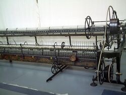 In a spinning mule, the roving is pulled off bobbins and sequentially fed through rollers operating at several different speeds, thinning the roving at a consistent rate. The yarn is twisted through the spinning of the bobbin as the carriage moves out, and is rolled onto a cop as the carriage returns. Mule spinning produces a finer thread than ring spinning.[6] Spinning by the mule machine is an intermittent process as the frame advances and returns. It is the descendant of a device invented in 1779 by Samuel Crompton, and produces a softer, less twisted thread that is favored for fines and for weft.