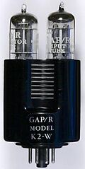 1953: A commercially available op amp. In 1953, vacuum tube op amps became commercially available with the release of the model K2-W from George A. Philbrick Researches, Incorporated. The designation on the devices shown, GAP/R, is an acronym for the complete company name. Two nine-pin 12AX7 vacuum tubes were mounted in an octal package and had a model K2-P chopper add-on available that would effectively "use up" the non-inverting input. This op amp was based on a descendant of Loebe Julie's 1947 design and, along with its successors, would start the widespread use of op amps in industry.