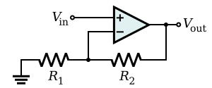 By combining terms, we determine the closed-loop gain ACL: [math]\displaystyle{ A_\text{CL} = \frac{V_\text{out}}{V_\text{in}} = 1 + \frac{R_\text{f}}{R_\text{g}} }[/math]