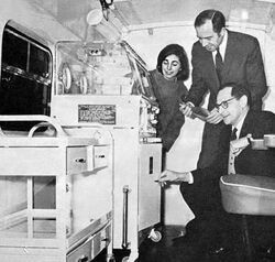 Neonatal transportation was first started by the American physician Joseph Bolivar DeLee (1869 –1942).[3] DeLee showed an intuitive interest in the care of preterm infants, recognising the necessity of a thermo-regulated environment during their transfer.[4] The first organised neonatal transportation program began in New York in 1948 and was called the New York Premature Infant Transport Service.[5] This remarkable system was created more than a decade before Neonatal Intensive Care Units (NICUs) were established, and incorporated many of the main characteristics of the modern neonatal transportation units. In 1968, in the United Kingdom, neonatologist Herbert Barrie introduced the country’s first dedicated neonatal ambulance.[6] Barrie obtained funding from the Variety Club charity for an ambulance that could collect babies requiring intensive care from maternity hospitals and bring them back to the neonatal intensive care unit at Charing Cross Hospital.[7][8]