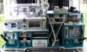 Newborn transport[1] is used to move premature and other sick infants from one hospital to another, such as a medical facility that has a neonatal intensive care unit and other services. Neonatal transport services such as NETS use mobile intensive care incubators fitted with mechanical ventilators, infusion pumps and physiological monitors capable of being used in a mobile environment.[2] These transport systems seek to emulate the environment of a neonatal intensive care and permit uninterrupted care to occur in a referring hospital and then during the journey by road or air ambulance. Power and medical gas supplies are carried within the system as well as making use of external supplies; as available. Infant transport systems commonly weigh over 100 kg and present a challenge to vehicle operators in terms of weight, manual handling, crashworthiness and power consumption. [citation needed]