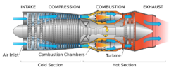 Turbojets consist of an inlet, a compressor, a combustor, a turbine (that drives the compressor) and a propelling nozzle. The compressed air is heated in the combustor and passes through the turbine, then expands in the nozzle to produce a high speed propelling jet[2]