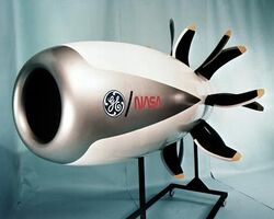 A propfan engine (also called "unducted fan", "open rotor", or "ultra-high bypass") is a jet engine that uses its gas generator to power an exposed fan, similar to turboprop engines. Like turboprop engines, propfans generate most of their thrust from the propeller and not the exhaust jet. The primary difference between turboprop and propfan design is that the propeller blades on a propfan are highly swept to allow them to operate at speeds around Mach 0.8, which is competitive with modern commercial turbofans. These engines have the fuel efficiency advantages of turboprops with the performance capability of commercial turbofans.[7] While significant research and testing (including flight testing) has been conducted on propfans, none have entered production.