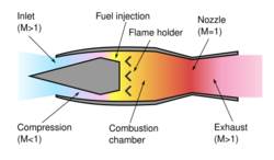 They consist of three sections; an inlet to compress incoming air, a combustor to inject and combust fuel, and a nozzle to expel the hot gases and produce thrust. Ramjets require a relatively high speed to efficiently compress the incoming air, so ramjets cannot operate at a standstill and they are most efficient at supersonic speeds. A key trait of ramjet engines is that combustion is done at subsonic speeds. The supersonic incoming air is dramatically slowed through the inlet, where it is then combusted at the much slower, subsonic, speeds.[18] The faster the incoming air is, however, the less efficient it becomes to slow it to subsonic speeds. Therefore, ramjet engines are limited to approximately Mach 5.[19]