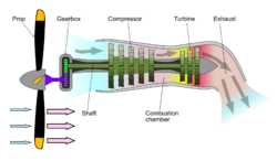 In turboprop engines, a portion of the engine's thrust is produced by spinning a propeller, rather than relying solely on high-speed jet exhaust. Producing thrust both ways, turboprops are occasionally referred to as a type of hybrid jet engine. They differ from turbofans in that a traditional propeller, rather than a ducted fan, provides the majority of thrust. Most turboprops use gear-reduction between the turbine and the propeller. (Geared turbofans also feature gear reduction, but they are less common.) The hot-jet exhaust is an important minority of thrust, and maximum thrust is obtained by matching the two thrust contributions.[4] Turboprops generally have better performance than turbojets or turbofans at low speeds where propeller efficiency is high, but become increasingly noisy and inefficient at high speeds.[5]