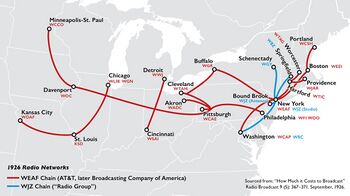Following the introduction of radio broadcasting in the early 1920s, the American Telephone and Telegraph Company (AT&T) developed the first radio network, linking together individual stations with specially prepared long-distance telephone lines in what at the time was called a "chain". The key station was AT&T's WEAF (now WFAN) in New York City . The network featured a variety of regularly scheduled programs which included sponsorships (at the time not called advertising but "toll broadcasting").[2]