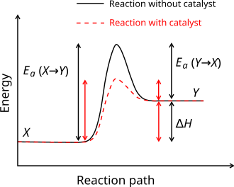 In order for a reaction to happen, there needs to be an activation energy. In the example of burning methane, you would need to light up a match or generate a fire that would start the combustion (burning) of methane. In other words: You need to give energy (in this case, in the form of heat) to initiate (activate) a reaction. The higher the activation energy, the less likely it is that individual molecules will transition into the reaction intermediate and then into their products. Imagine it like a mountain range: the higher the mountain (activation energy), the less likely it will be that hikers will overcome the peak (reaction intermediate) in order to reach the other side of the mountain range. If you were the hiker, all that matters is that you reach the other side of the mountain range. But what does that have to do with catalysts? Imagine if a catalyst is the mountain guide that helps you to reach the other side of the mountain by giving you an alternative route, e.g. a different, lower peak of a mountain within that mountain range. This is what catalysts essentially do! They reduce the activation energy by changing the path of the reaction and thus accelerating the speed by which the reaction happens. The chemical process in which catalysts are used is called catalysis.