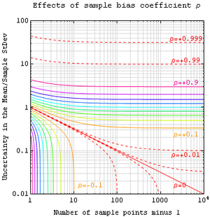 If values of the measured quantity A are not statistically independent but have been obtained from known locations in parameter space x, an unbiased estimate of the true standard error of the mean (actually a correction on the standard deviation part) may be obtained by multiplying the calculated standard error of the sample by the factor f: [math]\displaystyle{ f= \sqrt{\frac{1+\rho}{1-\rho}} , }[/math] where the sample bias coefficient ρ is the widely used Prais–Winsten estimate of the autocorrelation-coefficient (a quantity between −1 and +1) for all sample point pairs. This approximate formula is for moderate to large sample sizes; the reference gives the exact formulas for any sample size, and can be applied to heavily autocorrelated time series like Wall Street stock quotes. Moreover, this formula works for positive and negative ρ alike.[12] See also unbiased estimation of standard deviation for more discussion.