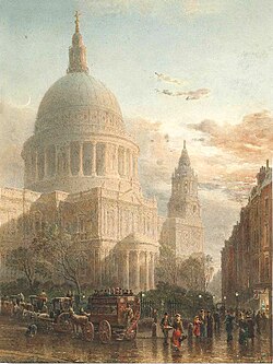 In 1710 Christopher Wren's masterpiece St Paul's Cathedral was completed, replacing its medieval predecessor, which burnt down in the Great Fire. The dome of St Paul's dominated the London skyline for centuries, inspiring the artworks and writing of William Blake, with his 1789 poem "Holy Thursday" referring to 'the high dome of Pauls'.[69] During the Georgian era new districts such as Mayfair were formed in the west; new bridges over the Thames encouraged development in South London. In the east the Port of London expanded downstream. London's development as an international financial centre matured for much of the 18th century.[70]