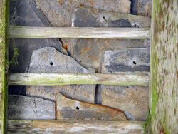 Slate tiles are often used for interior and exterior flooring,[25] stairs,[26] walkways[27] and wall cladding.[28] Tiles are installed and set on mortar and grouted along the edges. Chemical sealants are often used on tiles to improve durability and appearance,[29] increase stain resistance,[25] reduce efflorescence, and increase or reduce surface smoothness. Tiles are often sold gauged, meaning that the back surface is ground for ease of installation.[29] Slate flooring can be slippery when used in external locations subject to rain. Slate tiles were used in 19th century UK building construction (apart from roofs) and in slate quarrying areas such as Blaenau Ffestiniog and Bethesda, Wales there are still many buildings wholly constructed of slate. Slates can also be set into walls to provide a rudimentary damp-proof membrane. Small offcuts are used as shims to level floor joists. In areas where slate is plentiful it is also used in pieces of various sizes for building walls and hedges, sometimes combined with other kinds of stone. In modern homes slate is often used as table coasters.