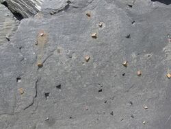 Slate is mainly composed of the minerals quartz, illite, and chlorite, which account for up to 95% of its composition. The most important accessory minerals are iron oxides (such as hematite and magnetite), iron sulfides (such as pyrite), and carbonate minerals. Feldspar may be present as albite or, less commonly, orthoclase.[10] Occasionally, as in the purple slates of North Wales, ferrous (iron(II)) reduction spheres form around iron nuclei, leaving a light-green, spotted texture. These spheres are sometimes deformed by a subsequent applied stress field into ovoids, which appear as ellipses when viewed on a cleavage plane of the specimen. However, some evidence shows that reduced spots may also form after deformation and acquire an elliptical shape from preferential infiltration along the cleavage direction, so caution is required in using reduction ellipsoids to estimate deformation.[11]