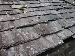 The foliation in slate, called "slaty cleavage",[1] is caused by strong compression in which fine-grained clay forms flakes to regrow in planes perpendicular to the compression.[1] When expertly "cut" by striking parallel to the foliation, with a specialized tool in the quarry, many slates display a property called fissility, forming smooth, flat sheets of stone, which have long been used for roofing, floor tiles, and other purposes.[1] Slate is frequently grey in color, especially when seen en masse covering roofs. However, slate occurs in a variety of colors even from a single locality; for example, slate from North Wales can be found in many shades of grey, from pale to dark, and may also be purple, green, or cyan. Slate is not to be confused with shale, from which it may be formed, or schist.
