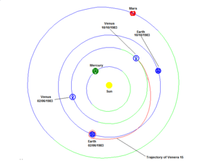 The spacecraft was inserted into Venus orbit a day apart from Venera 16, with its orbital plane shifted by an angle of approximately 4° relative to the other probe. This made it possible to reimage an area if necessary. The spacecraft was in a nearly polar orbit with a periapsis ~1000 km, at 62°N latitude, and apoapsis ~65000 km, with an inclination ~90°, the orbital period being ~24 hours.