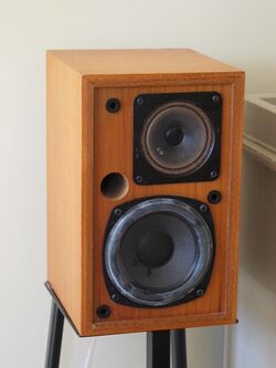 The Kub was a compact, two-way, bass reflex loudspeaker using a 5.25-inch diameter paper cone woofer (with flexible rubber surround) and a 3" paper cone tweeter. The paper cone tweeter looks very different from the silk or metal dome tweeters seen in many modern loudspeakers. Cone tweeters are more directional than dome tweeters and consequently the listening 'sweet spot' tends to be much smaller. The bass port, which vents air taken from the space behind the woofer, is mounted on the front of the enclosure.