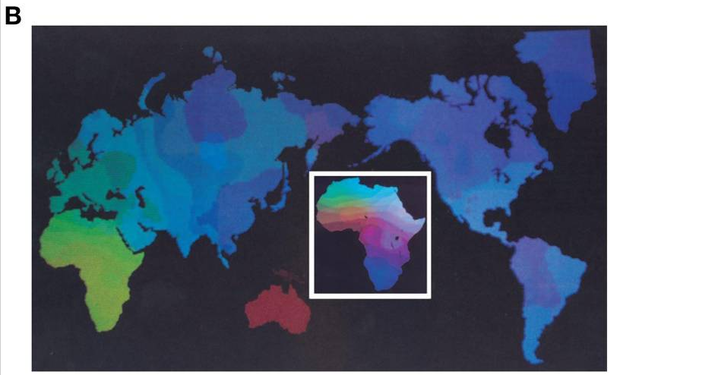 (right).[note 6] Note first that in the clinal map there are no sharp variations, only gradual changes, with innumerable "intermediary" cases between any two colors. Note second that the clinal map has some "fractal-ness": not only is there variation across locations (eg, Africa and Asia), but there is variation within locations (eg, Africa), and so no region is one homogeneous group.