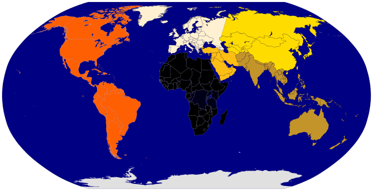 Johann Blumenbach's 1775 racial typologies mapped onto the modern world.[39] Modern "races" are derived from Blumenbach's typologies.