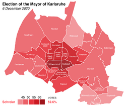 The current mayor of Karlsruhe is Frank Mentrup of the Social Democratic Party (SPD) since 2013. The most recent mayoral election was held on 6 December 2020, and the results were as follows: