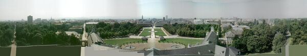 The city centre is the oldest part of town and lies south of the palace in the quadrant defined by nine of the radial streets. The central part of the palace runs east–west, with two wings, each at a 45° angle, directed southeast and southwest (i.e., parallel with the streets marking the boundaries of the quadrant defining the city center).