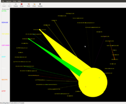A visual depiction of the traffic between some Tor relay nodes from the open-source packet sniffing program EtherApe