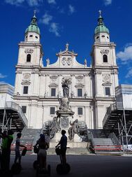 Rupert reconnoitred the river for the site of his basilica and chose Iuvavum. He ordained priests and annexed the manor of Piding. Rupert built a church at St. Peter on the site of today's cathedral and probably also founded the associated monastery and the Benedictine nunnery on Nonnberg for his relative Erentrude.[9] Salzburg has been the seat of a diocesan bishop since 739 CE[10] and an archbishopric since 798 CE. The first cathedral was built under Archbishop Virgil. The Franciscan Church existed since the beginning of the 9th century at the latest.[11] The Marienkirche dates from 1139.