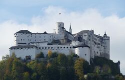 The first use of the German name Salzburg, meaning Salt-Castle, can be traced back to 739 CE when the name was used in Willibald's report on the organization of the Bavarian dioceses by Saint Boniface.[12] The name derives from the barges carrying salt on the River Salzach, which were subject to a toll in the 8th century as was customary for many communities and cities on European rivers. Hohensalzburg Fortress, the city's fortress was built on the site of a Roman fort[13] in 1077 by Archbishop Gebhard, who made it his residence.[14] It was greatly expanded during the following centuries. This site is not the site of the Roman castrum superius, which was located on the Nonnberg nearby.