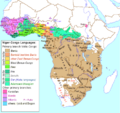 ![]() Map showing the distribution of major Niger–Congo languages. Pink-red is the Bantu subfamily. | |