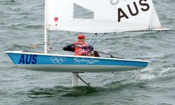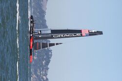 International A-class catamaran rule 8 initially allowed hydrofoils, but was changed to partially restrict them in 2009, in response to improving technology. The rule required "that all foils must be inserted from the top of the hull, and that there must be a minimum distance between the tips of the bottom of the boards of 75cm from the centreline".[19] The 2014 A-Class Catamaran World Titles in Takapuna New Zealand demonstrated early foiling capabilities to the class.[20] Now the A-Class can foil stably downwind in 6 knots and upwind in 12 knots or more. Peak speeds are reported to be about 30 knots and 2.5X wind speed.[21] The A-Class has set the standard for 4-point foiling that many classes are now adopting.[22]