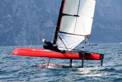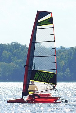 In 1998, WindRider LLC introduced the WindRider Rave,[28] a popular two-person trimaran hydrofoil capable of lifting off in as little as 12-13 knots of wind. The Rave is capable of sailing between 1.5 and 2 times wind speed.[29] The boat's mainsail has no boom. The Rave broke new ground in the development of flapped foils and control systems.