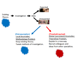 Dunbar and Fugelsang suggest that the process of discovery often starts when a researcher finds bugs in their experiment. These unexpected results lead a researcher to self-doubt, and to try and fix what they think is an error in their own methodology. The first recourse is to explain the error using local hypotheses (e.g. analogies typical of the discipline). This process is also local in the sense that the scientist is relatively independent or else working with one partner. Eventually, the researcher decides that the error is too persistent and systematic to be a coincidence. Self-doubt is complete, and so the methods shift to become more broad: The researcher begins to think of theoretical explanations for the error, sometimes seeking the help of colleagues across different domains of expertise. The highly controlled, cautious, curious and even social aspects of the scientific method are what make it well suited for identifying persistent systematic errors (anomalies).[2][7]
