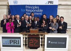 In early 2005, the then UN Secretary-General, Kofi Annan, invited a group of the world’s largest institutional investors to join a process to develop the Principles for Responsible Investment. A 20-person investor group drawn from institutions in 12 countries was supported by a 70-person group of experts from the investment industry, intergovernmental organisations and civil society. The Principles were launched in April 2006 at the New York Stock Exchange.