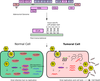 - Another layer of regulation that has emerged to control adenoviral replication is the use of microRNAs (miRNA) artificial target sites or miRNA response elements (MREs). Differential expression of miRNAs between healthy tissues and tumors permit to engineer oncolytic viruses in order to have their ability to replicate impaired in those tissues of interest while allowing its replication in the tumor cells.