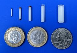Bruker MAS rotors. From left to right: 1.3 mm (up to 67 kHz), 2.5 mm (up to 35 kHz), 3.2 mm (up to 24 kHz), 4 mm (up to 15 kHz), 7 mm (up to 7 kHz)