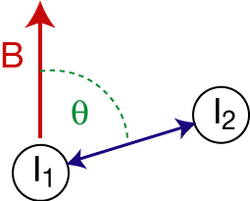 }[/math] is the vacuum permeability. In a strong magnetic field, the dipolar coupling depends on the angle θ between the internuclear vector and the external magnetic field B (figure) according to